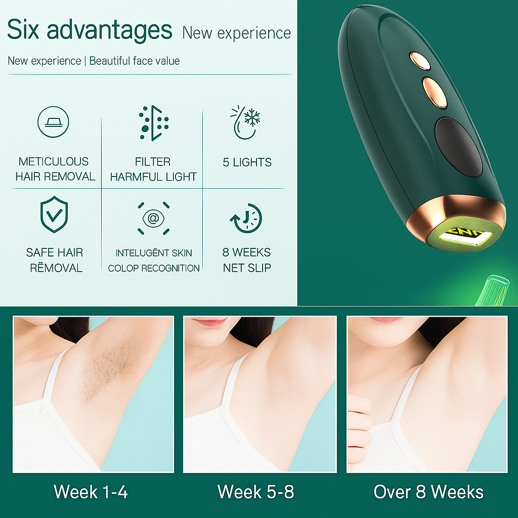 Designed for discerning routines, the device features customizable intensity settings, precision flash control, and a sleek, ergonomic form that glides effortlessly across the body. Safe for use on legs, underarms, bikini line, and even the face, it redefines hair removal as a luxurious, time-saving ritual.